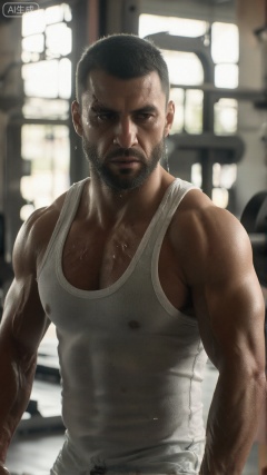 1man,Kyle Crane,chest,a voluptuous figure,High quality, bright, high-resolution,In a vibrant gym environment, a man is wearing a white vest and sweating profusely. His muscles tightened with each movement, and sweat slid down his cheeks. The lights spill through the huge windows, adding a touch of warmth. The background music is powerful and powerful, which inspires his fighting spirit. The entire scene is filled with the enthusiasm of movement and a tenacity, creating an inspiring atmosphere.