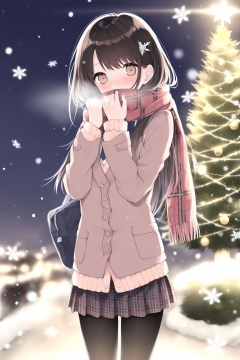1girl,solo,scarf,pantyhose,long hair,skirt,black pantyhose,snowing,blush,school uniform,brown eyes,plaid,hair ornament,christmas tree,bag,snow,enpera,pleated skirt,jacket,black hair,outdoors,plaid skirt,brown hair,plaid scarf,cardigan,school bag,covering mouth,snowflakes,christmas<lora:n11espSi10ra画风0.1版本XL:1>,siraxlhf
