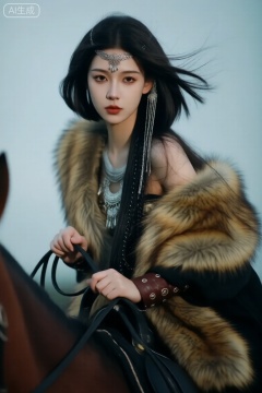古装写真,真人摄影,摆pose。现代风格。 故事感一位美丽的亚洲女生,皮草,复古装饰,银饰,金属额饰,碎发随风摆动,复古发饰,超长流苏,很多细碎辫子油画风唯美朦胧美手拿皮鞭,骑在马背上。 神秘,安静,清冷端庄清冷优雅知性清冷感妆容绝美少女妩媚y2k时尚精致服饰温柔大美人黑茶色长发,发型分层剪裁,内层过肩直发垂顺,外层及耳短发呈蓬松弧状包裹内层,发尾保留整体长发垂坠感,内外层通过层次落差形成立体轮廓。避免齐长发型、拒绝均匀发尾、不要整体短发。发梢微卷。 从容英气自带疏离感。唯美。艺术。大师级审美。。晕染,渲染。大师级构图,大师级配色,大师级打光,非传统构图的艺术,耀变+反射,年代,特写,微光,宿命感,故事感,宿命感,发丝飘扬飞舞