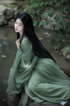 古装写真,Please cool down,beauty,This is a high-resolution photo of a young East Asian woman with long, straight black hair hanging down on her back. She sat on a rock by a calm shallow stream, surrounded by lush green plants. The woman's face had a calm, almost meditative expression, with her eyes closed and her lips slightly parted. She was wearing a traditional, flowing green robe made of soft and lightweight fabric, gently fluttering around her. This robe has a slight translucency that allows light to pass through, creating a subtle ethereal effect. Her hand gently gripped the fabric of the robe on her chest, as if gazing inward. The background is a mixture of natural elements: streams, rocks, and dense leaves, adding a peaceful and almost mysterious atmosphere to the scene. The soft and diffuse light enhances the peaceful atmosphere of the photo. The overall color tone is dominated by soft green and gentle earthy tones, forming a sharp contrast with the pale skin of women