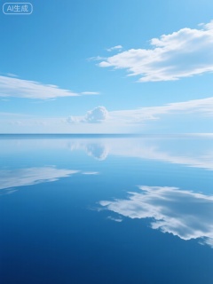 Create a 4K image of an outdoors sky during a sunny day, featuring a cloudy sky with blue tones. The scene should include a vast ocean with a horizon line, where the reflective water mirrors the sky's colors. Focus on the blue theme, emphasizing the reflection in the water and the horizon line. No humans should be visible in the image. Ensure the style is natural and realistic, capturing the serene and tranquil atmosphere of this coastal landscape.
