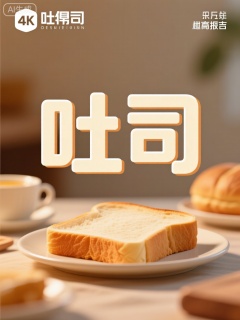 创建一个4K分辨率的广告字体设计,主题是“吐司”。设计风格现代简约,字体清晰可读,能够突出“吐司”这一主题。在视觉上,可以使用温暖的色调和柔软的质感来营造温馨舒适的早餐氛围。字体布局要简洁大方,同时保持一定的艺术感,使整个广告具有吸引力。整体情感氛围应该让人感到舒适、愉悦,仿佛正在享受一份美味的吐司带来的满足感。