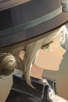 vertin \(reverse:1999\),1girl,black coat,boater hat,coat,freckles,from side,gradient background,green eyes,grey hair,hair bun,looking at viewer,portrait,profile,shirt,short hair,single side bun,solo,white shirt,<lora:光辉重返未来0.3版本XL-000004:1>,cfwl/zyhf,