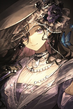 isolde \(reverse:1999\),1girl,black flower,black hair,black hat,blue butterfly,bug,butterfly,dark background,dress,flower,hair flower,hair ornament,hand up,hat,jewelry,long hair,looking at viewer,necklace,pearl necklace,portrait,purple dress,purple eyes,purple flower,see-through clothes,see-through veil,smile,solo,spotlight,veil,<lora:光辉重返未来0.3版本XL-000004:1>,cfwl/zyhf,