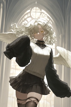 1girl,solo,angel,white eyelashes,(feathered wings:1.2),white hair,medium hair,long bangs,(wavy hair:1.3),fluffy hair,ringlets,(golden eyes:1.2),pale skin,small breasts,black skirt,black sweater,black thighhighs,cross hair ornament,metal collar,miniskirt,pleated skirt,skindentation,sleeves past fingers,smile,spiked collar,two-tone sweater,white sweater,white thighhighs,indoors,cathedral,looking at viewer, dynamic pose, <lora:光辉重返未来0.3版本XL-000004:1>,cfwl/zyhf,