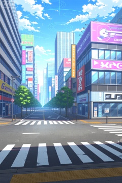 A digital illustration shoot from a perspective perspective about a futuristic cityscape with tall buildings and colorful signs, set against a bright blue sky with fluffy white clouds. the image also shows a city street with a zebra crossing in the foreground and a cityscape in the background. on the left side of the image, there are tall buildings with colorful signs and signage, including games center and association. on the right side, there is a building with a large shooting sign. the scene is bustling with activity, with a clear blue sky and a few clouds scattered throughout.