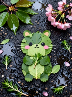 Fallen leaves, , whimsical artistic creation, natural elements, wet dark asphalt, green leaves body, black circular eyes, small pink nose, delicate pink cheeks, fine white whiskers, round light brown ears, tiny hands holding, sprig of greenery, scattered natural elements, soft pink cherry blossoms, dew-covered green leaves, small sprigs herbs, puddles reflecting scene, vibrant green and pink, dark wet background, nature-inspired composition