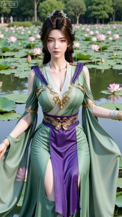 (masterpiece, best quality:1.2),1girl, navel, solo, midriff, bare shoulders, hair ornament,(long hair),(High double ponytail:1.19), red lips, BREAK, (looking at viewer:1.39), chinese clothes,(Holographic Color long dress:1.36), (lace,Rainbow Gradient Color:1.28), BREAK,blurry, solo focus, long hair, lips, daytime, lipstick, outdoors, standing,upper body,(huge breasts:2.89), background, solo, makeup,(Stockings, high heels:1.29),(huge breasts:2.99),(full breasts:2.99),,(Background with lotus pond and pink lotus flowers:1.39),XbaifengsongyuYH,Xbigbreasts,XmengkeerXHY,XliuyuH,Xyuanyaohongyi,Xyuanyaoxizao,Xyuanyaomuyu,Xyuanyaohongqun,XhanyunzhiXM,Xzhaoxinmeng,XxinruyinXM