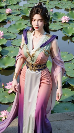 (masterpiece, best quality:1.2),1girl, navel, solo, midriff, bare shoulders, hair ornament,(long hair),(High double ponytail:1.19), red lips, BREAK, (looking at viewer:1.39), chinese clothes,(Holographic Color long dress:1.36), (lace,Rainbow Gradient Color:1.28), BREAK,blurry, solo focus, long hair, lips, daytime, lipstick, outdoors, standing,upper body,(huge breasts:2.89), background, solo, makeup,(Stockings, high heels:1.29),(huge breasts:2.99),(full breasts:2.99),,(Background with lotus pond and pink lotus flowers:1.39),,Xbigbreasts,XbaifengsongyuYH,XzhenniteH,XliuyuH,XfenghuangqipaoXF,XfenghuangqipaoXF,Xyuanyaohongqun,Xyuanyaomuyu,Xyuanyaoxizao,Xyuanyaohongyi,Xqixiucosplay,Xyechangong,XyechangongXF,XxinruyinXM,XhanyunzhiX,Xzhaoxinmeng,XhanyunzhiXM