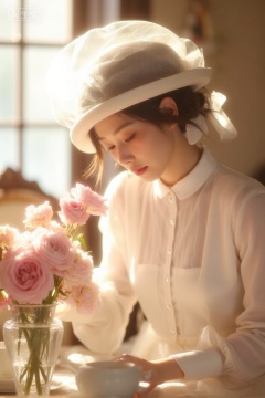 A woman in vintage white attire with a veiled hat,arranging flowers at a table,elegant setting with a vase of pink flowers,soft sunlight,romantic and retro atmosphere,delicate veiling,warm and gentle mood.,, Negative prompt: ng_deepnegative_v1_75t,(badhandv4:1.2),EasyNegative,(worst quality:2),,nsfw, Steps: 30, Sampler: Euler, CFG scale: 3.5, Seed: 1506755373, Size: 720x1080, Model hash: 8cba4f1ef4, Model: F.1基础算法模型-哩布在线可运行_F.1-dev-fp8.safetensors, Denoising strength: 0, RNG: CPU, Lora 1: 20250913-1757780180322-0001, Lora Hash 1: 2c61ab8cf8, Lora Weight 1: 0.8, vae_name: automatic