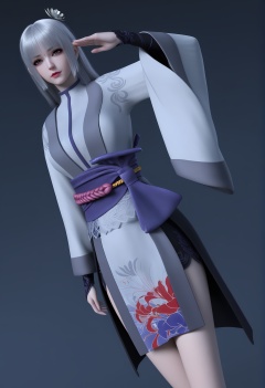 (score_9),dutch angle,cowboy shot,standing,<lora:苏红息-apony:0.83>,shuxihong,1girl,solo,red dot,long hair,silver hair,hair ornament,hair flower,bangs,single_flower,kimono,sash,short kimono,obi,bandages,floral print,legs,mature_female,BREAK<lora:Expressive_H-000001:0.8>,light blush,Expressiveh,from above,salute,one side up,<lora:e肤色滑块:0.25>,fair_skin,(pale skin),<lora:e色温:0.25>,ultra-detailed skin texture,detailed textures,<lora:皮肤凹痕:1.5>,<lora:RealisticSkinv1_ponyv6_loraplus:0.35>,real skin,BREAKsimple background,black background,4K ultra HD,sharp focus,high detail,high contrast,