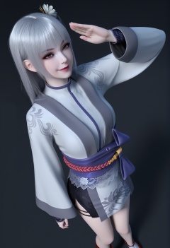 (score_9),dutch angle,cowboy shot,standing,<lora:苏红息-apony:0.83>,shuxihong,1girl,solo,red dot,long hair,silver hair,hair ornament,hair flower,bangs,single_flower,kimono,sash,short kimono,obi,bandages,floral print,legs,mature_female,BREAK<lora:Expressive_H-000001:0.8>,light blush,Expressiveh,seductive_smile,from above,salute,one side up,<lora:e肤色滑块:0.25>,fair_skin,(pale skin),<lora:e色温:0.25>,ultra-detailed skin texture,detailed textures,<lora:皮肤凹痕:1.5>,<lora:RealisticSkinv1_ponyv6_loraplus:0.35>,real skin,BREAKsimple background,black background,4K ultra HD,sharp focus,high detail,high contrast,