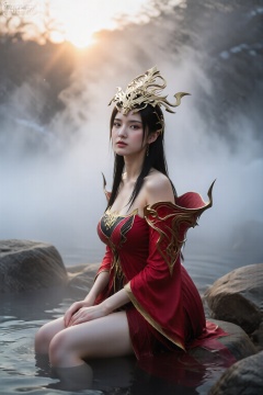 一位肌肤胜雪的女友,坐在露天温泉的岩石上,上半身构图。寒冷的冬日傍晚,温泉蒸腾起的大量热气在冷空气中遇冷,被夕阳的逆光穿透,形成了如梦似幻的氤氲光雾。