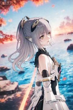 nanami/punishing gray raven,1girl, solo, long hair, bangs, thighhighs, dress, bare shoulders, yellow eyes, ponytail, grey hair, armor, gauntlets,brown cross shaped pupils,smile,pen mouth,sunset,scenery,leaf drop,leaf,from above,floating hair,messy hair,upper body,sea,detailed water,close up of the face,from side,dutch angle,