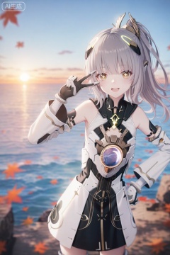 nanami/punishing gray raven,1girl, solo, long hair, bangs, thighhighs, dress, bare shoulders, yellow eyes, ponytail, grey hair, armor, gauntlets,brown cross shaped pupils,smile,pen mouth,sunset,scenery,leaf drop,leaf,from above,floating hair,messy hair,upper body,sea,detailed water,close up of the face,v over eye,one hand on hip,