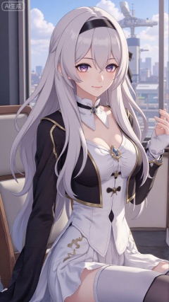 1girl, thighhighs, looking at viewer, bangs, long hair, purple eyes, headband, dress, long sleeves, mischevious smile, perfect body, scenery, sharp focus, best quality, masterpiece, detailed outfit, illustration, perfect eyes, finely detailed beautiful anime eyes, realistic skin, intricate details, best lighting, depth of field, ultra high resolution,sitting