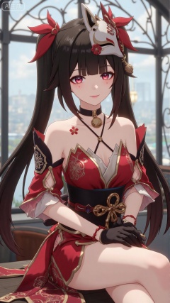 1girl, gloves, looking at viewer, long hair, twintails, bangs, hair ornament, fox mask, mask, brown hair, black gloves, bare shoulders, mischevious smile, perfect body, scenery, sharp focus, best quality, masterpiece, detailed outfit, illustration, perfect eyes, finely detailed beautiful anime eyes, realistic skin, intricate details, best lighting, depth of field, ultra high resolution,sitting