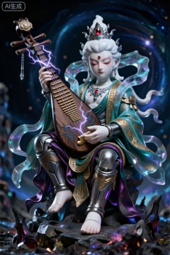 超现实主义手办设计,持国天王盘坐于虚空,身披青金色梵文刺绣袈裟,袈裟边缘泛着半透明冰裂纹釉光,内衬暗紫色绸缎,动态褶皱如波涛翻涌。手持四弦琵琶,琴身由千年雷击木雕琢,琴弦为发光银丝,拨动时迸发紫色闪电纹路。面部为冷白瓷质感,眉心镶嵌红宝石,双目微阖,嘴角含悲悯之相。脚下悬浮破碎的魔界岩石,背景为深蓝色星云漩涡,采用虚幻引擎5的Lumen全局光照,侧光勾勒出铠甲上的鎏金纹路,整体风格融合敦煌飞天与赛博朋克,8K分辨率,PBR材质呈现肌肤毛孔与织物纤维的微观细节