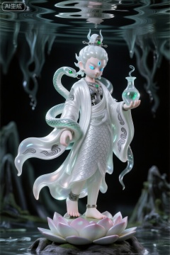超现实主义手办设计,广目天王单足立于莲花座,另一足轻点虚空,身姿如鹤立松巅。身着月白色蚕丝道袍,道袍表面覆盖细密鳞片状暗纹,袖口绣有水波纹,随风飘动时泛起涟漪光效。右手托净瓶,瓶中涌出透明琉璃蛇,蛇身缠绕左臂,蛇眼为发光绿宝石。面部为半透明玉雕质感,隐约可见内部机械结构,眉心竖瞳泛着幽蓝光芒。背景为倒悬的弱水之渊,水面倒映出扭曲的魔影,采用OC渲染器的次表面散射技术,呈现肌肤与织物的透光性,整体风格空灵诡谲。