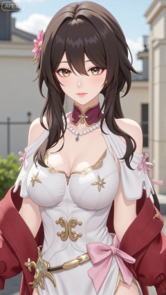1girl,solo,jewelry,flower,hair flower,hair ornament,necklace,realistic,brown eyes,looking at viewer,dress,blurry background,twin braids,blurry,white dress,long hair,upper body,breasts,pink bow,red jacket,bare shoulders,lips,collarbone,outdoors,cleavage,large natural breast,soft breasts,huge Breasts