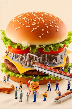 Miniature photography,Build a surreal and digital image in a 3D miniature landscape style. The core of the screen is a huge hamburger, with sesame seeds sprinkled on the surface, plump and clear grains, and a natural color. Fresh and tender lettuce leaves are lush green with delicate veins and textures; Tomato slices are round, with a full and glossy red color; Cheese is semi melted, slightly yellowed, and its delicate texture can be seen.When the burger was sliced open, there was a miniature factory hidden inside. The factory is fully equipped with various pipelines and mechanical parts with rich details, and a conveyor belt extends from the factory. Workers wearing neat work clothes and white gloves stand by the conveyor belt, focused on assembling hamburgers. Their expressions and movements are intricately depicted, showing a serious work ethic. Strangely, there are no workers on the conveyor belt, but various ingredients for assembling hamburgers are placed, such as bread slices, meat patties, etc. The texture and color of the ingredients are realistic.In the foreground of the picture, there is a statue of a small hamburger character, with a unique and interesting design and colorful display. These statues have rich expressions and various postures, some making cheering movements, while others seem to be carrying food, adding more vitality and fun to the picture. The entire scene is colorful, with elements complementing each other, creating a surreal world full of fantasy colors and rich details.,微缩场景