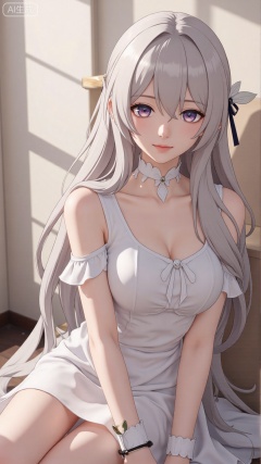 1girl, solo, long hair, breasts, looking at viewer, smile, bangs, dress, bare shoulders, jewelry, sitting, very long hair, closed mouth, white dress, bracelet, Light, shadow