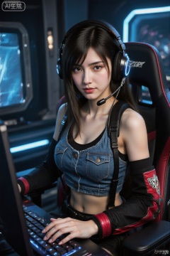 蒂法真人,一位专注的电竞少女女友,坐在充满科技感的电竞舱内,牛仔式上半身构图。她身穿你所在战队主题的定制队服(黑红配色),头戴发光耳机,手指轻搭机械键盘。屏幕蓝光映在她认真的脸庞上,眼神锐利自信,嘴角带着必胜的微笑。