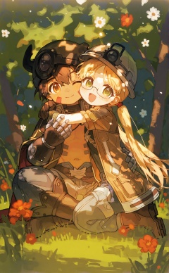 1girl,1boy,twintails,mechanical arms,glasses,helmet,blonde hair,headlamp,green eyes,hug,brown headwear,long hair,smile,brown hair,open mouth,pants,one eye closed,flower,facial mark,low twintails,navel,jacket,whistle around neck,grass,brown jacket,looking at viewer,brown gloves,open clothes,sitting,closed mouth,short sleeves,indian style,whistle,open jacket,yellow eyes,orange eyes,blue pants,gloves,white flower,child,dark skin,cape,pouch,coat,red flower,brown footwear,pith helmet,short hair,:d,hat,hair between eyes,dark-skinned male,puffy pants,boots,mechanical legs,very long hair,red cape,full body,on grass,topless male,brown eyes,brown coat,hug from behind,heads together,grey pants,horned helmet,open coat,semi-rimless eyewear,blush,outdoors,<lora:ciloranko-000040:1>,