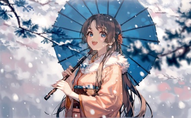 1girl,solo,umbrella,holding umbrella,japanese clothes,holding,long hair,kimono,blue eyes,oil-paper umbrella,branch,open mouth,smile,upper body,blue umbrella,sash,snow,tree,blurry,blurry foreground,obi,pink kimono,long sleeves,looking at viewer,snowing,fur trim,teeth,upper teeth only,black hair,winter,outdoors,brown hair,depth of field,:d,earrings,brown kimono,jewelry,orange kimono,<lora:ciloranko-000040:1>,