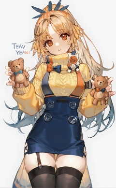 1girl, mole under eye, feather hair, mole, thighhighs, solo, stuffed toy, stuffed animal, garter straps, sweater, long hair, teddy bear, skirt, blue skirt, parted lips, suspenders, black thighhighs, suspender skirt, looking at viewer, simple background, buttons, thigh gap, turtleneck, cowboy shot, cable knit, ponytail, turtleneck sweater, long sleeves, aran sweater, grey background, yellow sweater, signature, blonde hair, orange eyes, zettai ryouiki, hair ornament, two-tone bow, holding, bow, feathers, orange hair, thighs, breasts, character name, feather hair ornament, skindentation, head tilt, medium breasts, high-waist skirt, miniskirt, holding stuffed toy, pencil skirt, blue bow <lora:ciloranko-000040:1>