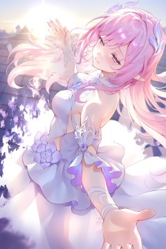 <lora:光辉V1昔涟角色V2:0.8>,xiliajn,1girl,solo,flower,long hair,pink hair,hair ornament,bare shoulders,pointy ears,dress,white dress,pink eyes,purple eyes,elf,hair flower,rose,jewelry,purple flower,white flower,diamond-shaped pupils,<lora:n11espJIMA中后期画风0.1版本XL:0.8>,iahhqxlhf,looking at viewer,sunrise,backlighting,leaning back,turning around,waving,goodbye,hand up,parted lips,sad smile,half-closed eyes,tearing up,rooftop,(dissolving:1.2),(fading:1.2),see-through body,chiaroscuro,open hand,