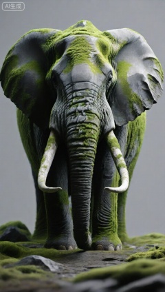 这是一幅极具奇幻色彩的CG作品,描绘了一头仿佛由岩石和苔藓构成的大象。大象的身躯和耳朵呈现出灰黑色的岩石质感,表面粗糙,带有自然的纹理和裂缝,仿佛历经岁月的侵蚀。而岩石的部分区域覆盖着鲜绿色的苔藓,尤其是在头顶、背部和腿部,给它增添了一丝生机,仿佛与自然融为一体。大象的长鼻、象牙和眼睛细节逼真,整体形象既有着岩石的坚硬感,又因苔藓的存在而显得柔和且富有生命力,营造出一种神秘而独特的氛围。