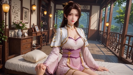 score_9, score_8, GF3D,1girl, cleavage, imminent hand holding, looking_at_viewer, exquisite_skin, side_sitting, front_lighting, even_light, dynamic_angle