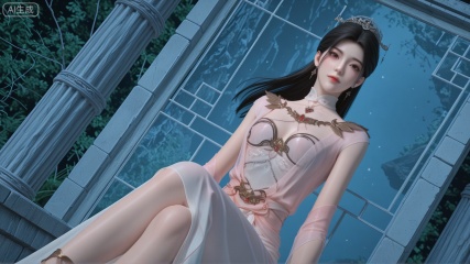 GF3D, class 1 GF3D,GF3D screen,1girl,ZX clothes, looking_at_viewer, exquisite_skin, side_sitting, glass_wall, outdoor, front_lighting, even_light, dynamic_angle, floating_hair, direct_gaze