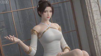 GF3D, class 2 GF3D,1girl,SY clothes, outstretched hand, looking_at_viewer, exquisite_skin, side_sitting, glass_wall, outdoor, front_lighting, even_light, dynamic_angle