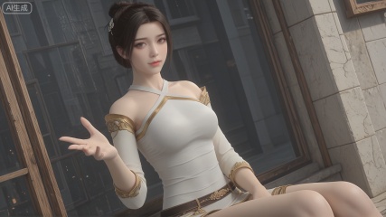 class 2 GF3D,1girl,SY clothes, outstretched hand, looking_at_viewer, exquisite_skin, side_sitting, glass_wall, outdoor, front_lighting, even_light, dynamic_angle