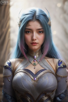 该图像具有女性角色,带有醒目,柔和的头发,从顶部的蓝色转变为末端的粉红色。她的脸上有一张对称的脸,眉毛和黑眼睛似乎略微凝视着侧面。她的头上是两个华丽的角式配件,并带有复杂的金色设计。她穿着合身的高领衣服,似乎是由金属或装甲材料制成的,上面装饰着精美的金色图案和紫色的宝石。这件衣服具有结构化的紧身胸衣般的设计,可以突出她的身材。在她的脖子上,她有一条精致的项链,上面有泪珠形的吊坠。背景被轻轻地照亮,带有模糊的元素,暗示着空灵或幻想的环境,可能是森林或寺庙,带有柔和的光线过滤。整体构图是详尽且梦幻的,重点是角色的精致服装和宁静的表达。