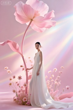 营造出一种神奇而超凡脱俗的光晕。这种风格融合了现实主义与奇幻元素,中式简约风格女子着白色简约长裙,身处粉色背景中,巨大粉色花茎与小花环绕,画面清新柔美,似置身童话花境。