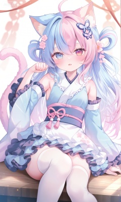 1girl, solo, long hair, looking at viewer, blush, bangs, blue eyes, hair ornament, red eyes, thighhighs, long sleeves, dress, bow, holding, animal ears, sitting, blue hair, tail, pink hair, multicolored hair, frills, detached sleeves, japanese clothes, cat ears, wide sleeves, pink eyes, kimono, white thighhighs, cat tail, animal ear fluff, heterochromia, cat girl