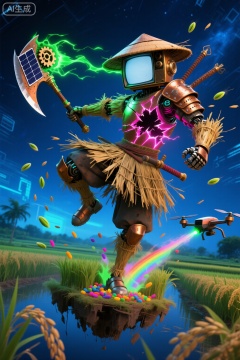 赛博武士形态稻草人,头部为老式电视机屏幕,播放着泰国武侠动画。身体覆盖着发光稻草与金属装甲,手持的镰刀由太阳能板与齿轮组成,刀刃喷射出毒绿色能量流。脚下踩着悬浮的稻田模型,喷射出彩虹色肥料颗粒,背后悬浮着故障艺术风格的斗笠。