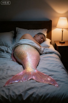 Merfolk clan, A middle - aged male mermaid sleeps in bed. He has a bare upper body, and his fishtail has iridescent pink - gold scales. The bed has light - colored sheets, and a lamp on the bedside table emits warm light, creating a peaceful and quiet atmosphere.