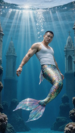 A muscular male mermaid is swimming underwater, wearing a white vest. His tails are rainbow-colored scales. The sun shines through the clear blue water, surrounded by bubbles and rocks. Create a vivid underwater scene, and there are many magnificent palace buildings in the sea.,Merfolk clan,The mermaid swims in a recumbent position like a crucian carp,