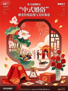ZSCY,该图像是标题为“中式婚俗”文化体验活动的宣传海报,该活动被定义为“感受传统浪漫与美好寓意”。背景是喜庆的大红色渐变,彰显出热烈而欢快的氛围。在顶部中心,有一株盛开的并蒂莲,花丛中有一对鸳鸯在嬉戏。鸳鸯下方,是一个大气的双喜字窗,这是中式婚礼中常见的吉祥元素。窗内呈现出一幅热闹的婚礼场景,有花轿、迎亲队伍,新郎新娘拜堂的画面以及天空中绽放的烟花。前景中,摆放着一些中式婚礼用品,如红盖头、喜秤、喜糖盒,还有几束红色的玫瑰和几片金色的花瓣。整体设计结合了传统中式元素,如双喜字窗、并蒂莲、鸳鸯与中式婚礼用品,都以现代喜庆的插画风格呈现。