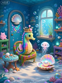 ZYCH,该图像描绘了一个宁静、梦幻的海底房间,墙壁是深邃而柔和的蓝色(模拟海水),营造出神秘而惬意的氛围。在中心,一只拥有五彩鳞片、眼睛像明亮珍珠的大海马,头戴一顶由珊瑚和贝壳组成的华丽皇冠,皇冠上还镶嵌着一颗闪烁的粉色珍珠。海马坐在一个由彩色海草编织成的吊椅上,吊椅旁边有一个由气泡组成的小桌子,上面摆放着一些小巧的海星和贝壳装饰品。在海马的右侧,一只小巧玲珑、全身透明的小水母,带着温柔的表情,靠近一个旋转的彩色贝壳。贝壳内部发出五彩的光芒,照亮了周围的水流。背景中,左侧是一扇由巨大的贝壳组成的门,门上镶嵌着一些闪亮的鱼鳞;右侧的窗户由透明的气泡构成,阳光透过气泡洒下,在窗台上照亮一盆摇曳的海草。沿着墙壁的架子上摆满了各种物品:左侧绿色架子上坐着一只抱着珍珠的粉色小海星玩偶,右侧架子上则有更多的海洋小宝藏,如彩色的珊瑚枝和小小的海螺号,还有几盏散发着幽蓝色光芒的小灯。地板上铺着一层细腻的银色沙子,房间里漂浮着许多五彩斑斓的气泡,增强了其神奇而治愈的氛围。整个场景将海底的神秘与梦幻般的童话元素融合在一起。