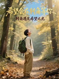ZYHB,画面主体是一个站在古老森林小径上的人,微微仰头,凝视着透过树叶缝隙洒下的阳光。此人穿着卡其色的休闲裤和一件米白色的针织开衫,背着一个深绿色的双肩背包。森林里树木高大茂密,地上铺满了厚厚的落叶,散发着淡淡的腐木香气。阳光如金色的丝线,在林间穿梭跳跃。背景的天空被树冠遮挡,只露出些许斑驳的蓝色。画面中心以金色的大字写着“希望会在转角等你”(希望会在转角处出现),下方用深棕色的楷书字体写着“转角遇见希望之光”。文字与森林的静谧氛围相融合,传递出积极向上的力量。
