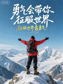 ZYHB,主体是一个站在雪山顶峰的人,张开双臂,尽情拥抱眼前的壮丽景色。此人穿着鲜红色的冲锋衣和黑色的防风裤,脚蹬一双厚重的登山靴,背着一个专业的登山包。周围是皑皑白雪,山峰连绵起伏,在阳光的照耀下闪耀着银色的光芒。天空湛蓝而纯净,没有一丝云彩。画面中心用白色的大字写着“勇气会带你征服世界”(勇气会引领你征服一切),下方以金色的行书字体写着“征服世界靠勇气”。文字与雪山的雄伟气势相融合,彰显出无畏的精神。