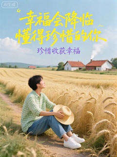 ZYHB,图像描绘了一位坐在乡村田野小道旁的人,看着眼前金黄的麦浪随风起伏。此人穿着一件浅绿色的格子衬衫和一条蓝色的牛仔裤,脚蹬一双白色的运动鞋,手里拿着一顶草帽。田野里,麦穗饱满,在微风中轻轻摇曳,发出沙沙的声响。远处有几座红瓦白墙的农舍,炊烟袅袅升起。天空呈现出淡蓝色,点缀着几朵洁白的云朵。画面中心用黄色的大字写着“幸福会降临懂得珍惜的你”(幸福会眷顾懂得珍惜的人),下方以淡紫色的楷书字体写着“珍惜收获幸福”。文字与乡村田野的质朴氛围相契合,传递出对生活的感恩之情。