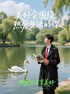 ZYHB,主体是一个站在城市公园湖边的人,看着湖中的天鹅优雅地游动。此人穿着一件黑色的风衣,内搭一件白色的衬衫,系着一条红色的领带,手里拿着一本杂志。公园里绿树成荫,湖水清澈碧绿,岸边的垂柳依依,倒映在水中。天空中飘着几朵洁白的云朵,阳光透过树叶的缝隙洒在湖面上,波光粼粼。画面中心用白色的大字写着“美好会围绕热爱生活的你”(美好会围绕热爱生活的人),下方以绿色的草书字体写着“热爱生活享美好”。文字与公园的宁静优美相融合,激发人们对生活的热爱之情。