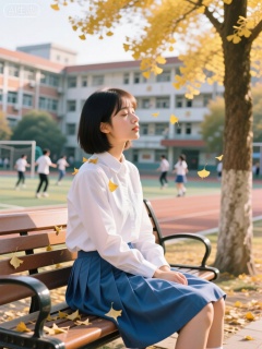 JPG,画面聚焦于一位身着白色校服衬衫和蓝色百褶裙的年轻女子特写。她有着一头黑色的齐耳短发,安静地坐在校园的长椅上,双眼轻闭,回忆着校园秋日的美好时光。长椅旁是一棵金黄的银杏树,树叶纷纷飘落,落在她的肩头和脚边。背景是校园的教学楼和操场,同学们在操场上嬉笑玩耍。光线柔和而明亮,带着胶片的清新感,形成淡淡的阴影,突出了女子发丝和校服的纹理。整个场景充满了青春与纯真的胶片氛围,让人感受到校园生活的美好与难忘。