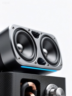 GYCP,该图像聚焦于高端音响系统的特写。核心亮点在于那对由铝合金精心雕琢而成的扬声器外壳,表面经过阳极氧化处理,呈现出深邃的太空灰,透着冷峻的科技感。每个扬声器单元中央镶嵌着一颗圆形的磁铁,周围环绕着精密的线圈结构,共两组这样的精密组合。外壳边缘通过激光焊接技术无缝衔接,展现出极致的工艺水准,表面光滑如镜,反射出细腻的光泽。在扬声器的后方,一块蓝色的LED指示灯带悄然点亮,为整体增添了一抹未来感。音响的底座采用黑色碳纤维材质,轻盈而坚固,表面有着独特的编织纹理。部分连接线在图像的下方隐约可见,采用高纯度铜芯,外层包裹着柔软的黑色绝缘套。图像右下方还能看到一个银色的调节旋钮,表面刻有精细的刻度。背景是纯白色的,简洁干净,让音响成为视觉的绝对中心。